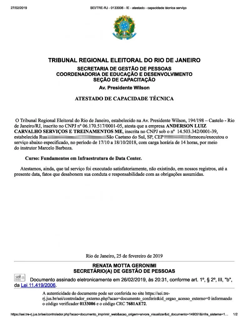 “Gostei do curso, acho que é uma ferramenta importante para ampliar conhecimento no segmento de segmento de Datacenter. Curso com conteúdo atual e bem didático, atendeu todas as minhas expectativas, mesmo com a carga horaria de 14 horas, os temas foram muito bem explanado, mesmo sendo abordado diversos segmentos distintos dentro de data center. Parabenizo a equipe principalmente ao instrutor Marcelo, pelo conteúdo apresentado durante o curso, muito obrigado”.